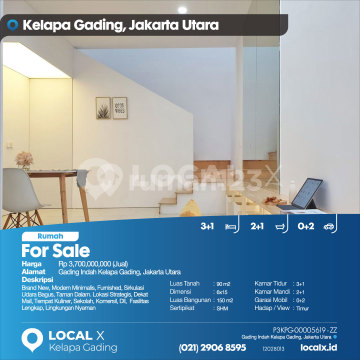 Brand New, Modern Minimalis, Furnished, Sirkulasi Udara Bagus, Taman Dalam. Lokasi Strategis, Dekat Mall, Tempat Kuliner, Sekolah, Komersil, Dll, Fasilitas Lengkap, Lingkungan Nyaman For Sale - Jual Rumah Gading Indah Kelapa Gading, Jakarta Utara Harga. Rp 370000xxxxJual) Deskripsi Properti. Brand New, Modern Minimalis, Furnished, Sirkulasi Udara Bagus, Taman Dalam. Lokasi Strategis, Dekat Mall, Tempat Kuliner, Sekolah, Komersil, Dll, Fasilitas Lengkap, Lingkungan Nyaman Luas Tanah. 90 m2 Dimensi. 6x15 Luas Bangunan. 150 m2 Sertipikat. SHM Kamar Tidur. 3+1 Kamar Mandi. 2+1 Garasi Mobil. 0+2 Hadap / View. Timur LOCAL X Kelapa Gading ******** ⓪②① ②⑨⓪⑥ ⑧⑤⑨⑤ P3KPG-0000xxxx-ZZ-J