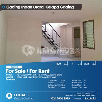 For Sale / For Rent - Jual / Sewa Rumah Gading Indah Utara Kelapa Gading, Jakarta Utara Harga. Rp 190000xxxxJual) / Rp 4500xxxxSewa/Tahun) Deskripsi Properti. Luas Tanah. 90 m2 Dimensi. 6x15 Luas Bangunan. 90 m2 Sertipikat. SHM Kamar Tidur. 2+2 Kamar Mandi. 1 Garasi Mobil. 0+2 Hadap / View. Barat LOCAL X Kelapa Gading ******** ⓪②① ②⑨⓪⑥ ⑧⑤⑨⑤ P3KPG-0000xxxx-ZZ-J/S