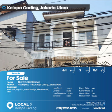 Brand New, Siap Huni, Lokasi Strategis,, Dekat Sekolah, MKG For Sale - Jual Rumah Gading Mas Timur, Kelapa Gading, Jakarta Utara Harga. Rp 237500xxxxJual) Deskripsi Properti. Brand New, Siap Huni, Lokasi Strategis,, Dekat Sekolah, MKG Luas Tanah. 90 m2 Dimensi. 6x15 Luas Bangunan. 150 m2 Sertipikat. SHM Kamar Tidur. 4+1 Kamar Mandi. 3 Garasi Mobil. 0+1 Hadap / View. Selatan LOCAL X Kelapa Gading ******** ⓪②① ②⑨⓪⑥ ⑧⑤⑨⑤ P3KPG-0000xxxx-ZZ-J