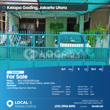 Lokasi Strategis, Siap Huni, Dekat Pasar For Sale - Jual Rumah Gading Putih Kelapa Gading, Jakarta Utara Harga. Rp 210000xxxxJual) Deskripsi Properti. Lokasi Strategis, Siap Huni, Dekat Pasar Luas Tanah. 96 m2 Dimensi. 5x18 Luas Bangunan. 60 m2 Sertipikat. SHM Kamar Tidur. 3+1 Kamar Mandi. 2 Garasi Mobil. 0+1 Hadap / View. Barat LOCAL X Kelapa Gading ******** ⓪②① ②⑨⓪⑥ ⑧⑤⑨⑤ P3KPG-0000xxxx-JW-J