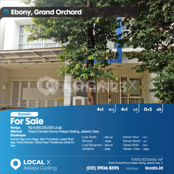 Rumah Siap Huni, Nego, Semi Furnished, Lokasi Strategis, Dekat Sekolah, Dekat Pasar Tradisional, Dekat Kuliner For Sale - Jual Rumah Grand Orchard Ebony Kelapa Gading, Jakarta Utara Harga. Rp 680000xxxxJual) Deskripsi Properti. Rumah Siap Huni, Nego, Semi Furnished, Lokasi Strategis, Dekat Sekolah, Dekat Pasar Tradisional, Dekat Kuliner Luas Tanah. 200 m2 Dimensi. 10x20 Luas Bangunan. 250 m2 Sertipikat. SHM Kamar Tidur. 4+1 Kamar Mandi. 4+1 Garasi Mobil. 0+2 Hadap / View. Utara LOCAL X Kelapa Gading ******** ⓪②① ②⑨⓪⑥ ⑧⑤⑨⑤ Whatsapp/Call. Mariana - ⓪⑧①⑥④⑧③⓪⑤⑤⓪ P3KPG-0000xxxx-MT-J
