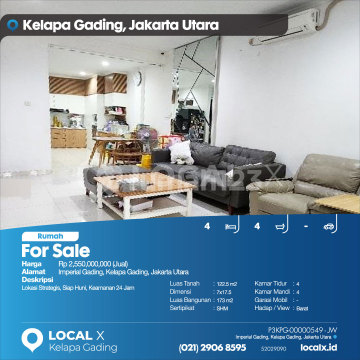Lokasi Strategis, Siap Huni, Keamanan 24 Jam For Sale - Jual Rumah Imperial Gading, Kelapa Gading, Jakarta Utara Harga. Rp 255000xxxxJual) Deskripsi Properti. Lokasi Strategis, Siap Huni, Keamanan 24 Jam Luas Tanah. 122.5 m2 Dimensi. 7x17.5 Luas Bangunan. 173 m2 Sertipikat. SHM Kamar Tidur. 4 Kamar Mandi. 4 Garasi Mobil. - Hadap / View. Barat LOCAL X Kelapa Gading ******** ⓪②① ②⑨⓪⑥ ⑧⑤⑨⑤ P3KPG-0000xxxx-JW-J