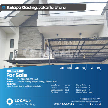 Lokasi Strategis, Keamanan 24 Jam, Jalan Lebar For Sale - Jual Rumah Imperial Gading, Kelapa Gading, Jakarta Utara Harga. Rp 270000xxxxJual) Deskripsi Properti. Lokasi Strategis, Keamanan 24 Jam, Jalan Lebar Luas Tanah. 120 m2 Dimensi. 8x15 Luas Bangunan. 96 m2 Sertipikat. SHM Kamar Tidur. 3+1 Kamar Mandi. 2+1 Garasi Mobil. 2 Hadap / View. Barat LOCAL X Kelapa Gading ******** ⓪②① ②⑨⓪⑥ ⑧⑤⑨⑤ P3KPG-0000xxxx-WH-J