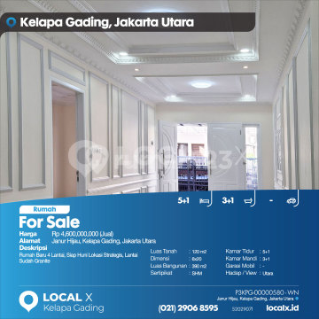 Rumah Baru 4 Lantai, Siap Huni Lokasi Strategis, Lantai Sudah Granite For Sale - Jual Rumah Janur Hijau, Kelapa Gading, Jakarta Utara Harga. Rp 460000xxxxJual) Deskripsi Properti. Rumah Baru 4 Lantai, Siap Huni Lokasi Strategis, Lantai Sudah Granite Luas Tanah. 120 m2 Dimensi. 6x20 Luas Bangunan. 390 m2 Sertipikat. SHM Kamar Tidur. 5+1 Kamar Mandi. 3+1 Garasi Mobil. - Hadap / View. Utara LOCAL X Kelapa Gading ******** ⓪②① ②⑨⓪⑥ ⑧⑤⑨⑤ P3KPG-0000xxxx-WN-J