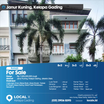 Lingkungan Aman, Bebas Banjir, Akses Mudah, Terletak di Tengah Kelapa Gading, Dekat Pusat Perbelanjaan, Sekolah dll For Sale - Jual Rumah Janur Kuning, Kelapa Gading, Jakarta Utara Harga. Rp 750000xxxxJual) Deskripsi Properti. Lingkungan Aman, Bebas Banjir, Akses Mudah, Terletak di Tengah Kelapa Gading, Dekat Pusat Perbelanjaan, Sekolah dll Luas Tanah. 270 m2 Dimensi. 18x15 Luas Bangunan. 525 m2 Sertipikat. SHM Kamar Tidur. 8+2 Kamar Mandi. 5+2 Garasi Mobil. 0+3 Hadap / View. Barat Laut LOCAL X Kelapa Gading ******** ⓪②① ②⑨⓪⑥ ⑧⑤⑨⑤ Whatsapp/Call. Mariana - ⓪⑧①⑥④⑧③⓪⑤⑤⓪ P3KPG-0000xxxx-MT-J