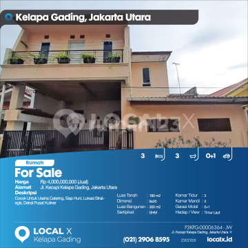 Cocok Untuk Usaha Catering, Siap Huni, Lokasi Strategis, Dekat Pusat Kuliner For Sale - Jual Rumah Kecapi Kelapa Gading, Jakarta Utara Harga. Rp 400000xxxxJual) Deskripsi Properti. Cocok Untuk Usaha Catering, Siap Huni, Lokasi Strategis, Dekat Pusat Kuliner Luas Tanah. 180 m2 Dimensi. 9x20 Luas Bangunan. 300 m2 Sertipikat. SHM Kamar Tidur. 3 Kamar Mandi. 3 Garasi Mobil. 0+1 Hadap / View. Timur Laut LOCAL X Kelapa Gading ******** ⓪②① ②⑨⓪⑥ ⑧⑤⑨⑤ P3KPG-0000xxxx-JW-J