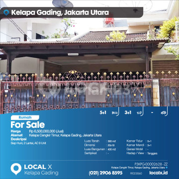 Siap Huni, 2 Lantai, AC 9 Unit For Sale - Jual Rumah Kelapa Cengkir Timur, Kelapa Gading, Jakarta Utara Harga. Rp 650000xxxxJual) Deskripsi Properti. Siap Huni, 2 Lantai, AC 9 Unit Luas Tanah. 360 m2 Dimensi. 20x18 Luas Bangunan. 400 m2 Sertipikat. - Kamar Tidur. 5+1 Kamar Mandi. 3+1 Garasi Mobil. - Hadap / View. Tenggara LOCAL X Kelapa Gading ******** ⓪②① ②⑨⓪⑥ ⑧⑤⑨⑤ P3KPG-0000xxxx-ZZ-J