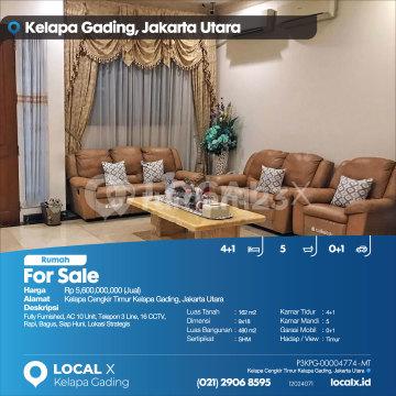 Fully Furnished, AC 10 Unit, Telepon 3 Line, 16 CCTV, Rapi, Bagus, Siap Huni, Lokasi Strategis For Sale - Jual Rumah Kelapa Cengkir Timur Kelapa Gading, Jakarta Utara Harga. Rp 560000xxxxJual) Deskripsi Properti. Fully Furnished, AC 10 Unit, Telepon 3 Line, 16 CCTV, Rapi, Bagus, Siap Huni, Lokasi Strategis Luas Tanah. 162 m2 Dimensi. 9x18 Luas Bangunan. 480 m2 Sertipikat. SHM Kamar Tidur. 4+1 Kamar Mandi. 5 Garasi Mobil. 0+1 Hadap / View. Timur LOCAL X Kelapa Gading ******** ⓪②① ②⑨⓪⑥ ⑧⑤⑨⑤ Whatsapp/Call. Mariana - ⓪⑧①⑥④⑧③⓪⑤⑤⓪ P3KPG-0000xxxx-MT-J