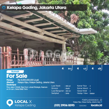 Row Jalan 2 Mobil, Siap Huni, Lokasi Strategis, Keamanan 24 Jam, Dekat Bella Terra For Sale - Jual Rumah Kelapa Hijau, Kelapa Gading, Jakarta Utara Harga. Rp 800000xxxxJual) Deskripsi Properti. Row Jalan 2 Mobil, Siap Huni, Lokasi Strategis, Keamanan 24 Jam, Dekat Bella Terra Luas Tanah. 400 m2 Dimensi. 20x20 Luas Bangunan. 450 m2 Sertipikat. SHM Kamar Tidur. 4 Kamar Mandi. 4 Garasi Mobil. 4 Hadap / View. Selatan LOCAL X Kelapa Gading ******** ⓪②① ②⑨⓪⑥ ⑧⑤⑨⑤ P3KPG-0000xxxx-ZZ-J