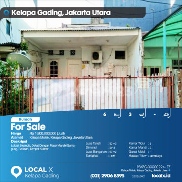 Lokasi Strategis, Dekat Dengan Pasar Mandiri Sumagung, Sekolah, Tempat Kuliner For Sale - Jual Rumah Kelapa Molek, Kelapa Gading, Jakarta Utara Harga. Rp 180000xxxxJual) Deskripsi Properti. Lokasi Strategis, Dekat Dengan Pasar Mandiri Sumagung, Sekolah, Tempat Kuliner Luas Tanah. 90 m2 Dimensi. 5x18 Luas Bangunan. 90 m2 Sertipikat. SHM Kamar Tidur. 6 Kamar Mandi. 3 Garasi Mobil. - Hadap / View. Barat Daya LOCAL X Kelapa Gading ******** ⓪②① ②⑨⓪⑥ ⑧⑤⑨⑤ P3KPG-0000xxxx-ZZ-J