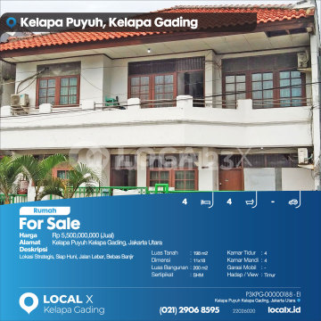 Lokasi Strategis, Siap Huni, Jalan Lebar, Bebas Banjir For Sale - Jual Rumah Kelapa Puyuh Kelapa Gading, Jakarta Utara Harga. Rp 550000xxxxJual) Deskripsi Properti. Lokasi Strategis, Siap Huni, Jalan Lebar, Bebas Banjir Luas Tanah. 198 m2 Dimensi. 11x18 Luas Bangunan. 200 m2 Sertipikat. SHM Kamar Tidur. 4 Kamar Mandi. 4 Garasi Mobil. - Hadap / View. Timur LOCAL X Kelapa Gading ******** ⓪②① ②⑨⓪⑥ ⑧⑤⑨⑤ P3KPG-0000xxxx-EI-J