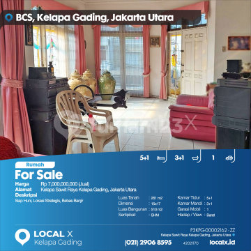 Siap Huni, Lokasi Strategis, Bebas Banjir For Sale - Jual Rumah Kelapa Sawit Raya Kelapa Gading, Jakarta Utara Harga. Rp 700000xxxxJual) Deskripsi Properti. Siap Huni, Lokasi Strategis, Bebas Banjir Luas Tanah. 261 m2 Dimensi. 15x17 Luas Bangunan. 510 m2 Sertipikat. SHM Kamar Tidur. 5+1 Kamar Mandi. 3+1 Garasi Mobil. 1 Hadap / View. Barat LOCAL X Kelapa Gading ******** ⓪②① ②⑨⓪⑥ ⑧⑤⑨⑤ P3KPG-0000xxxx-ZZ-J