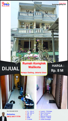 DIJUAL / DISEWAKAN – Rumah di Komplek Walikota, Kelapa Gading, Jakarta Utara Temukan rumah besar di lokasi prestisius Kelapa Gading, Jakarta Utara. Rumah ini menawarkan ruang luas dan fasilitas lengkap yang sangat cocok untuk keluarga besar, tempat usaha, atau investasi properti. Dengan 18 kamar tidur dan 7 kamar mandi, properti ini menjamin kenyamanan maksimal di salah satu kawasan paling diminati di Jakarta Utara. Lokasi Strategis di Kelapa Gading: Terletak di lingkungan eksklusif dan tenang. Dekat dengan berbagai pusat bisnis, mal, dan fasilitas umum di Kelapa Gading. Akses mudah ke pusat kota, transportasi publik, dan jalan tol. Detail Properti: Luas Tanah: 120 m² Luas Bangunan: 360 m² Kamar Tidur: 18 Kamar Mandi: 7 Listrik: 7.700 Watt Air: PAM AC: 11 unit Garasi: 1 mobil Carport: 1 mobil Furnish: Furnished Lantai: Keramik Sertifikat: SHM Keunggulan Properti: Luas dan lengkap, ideal untuk tempat tinggal atau usaha. Lokasi strategis di kawasan Kelapa Gading yang bergengsi dan berkembang. Dekat dengan fasilitas sekolah, pusat perbelanjaan, rumah sakit, dan akses tol. Nilai properti terus meningkat, menjamin potensi investasi yang tinggi. Harga: Rp 8 M (Nego) Hubungi Sekarang: Telp: 08783737xxxx WhatsApp: ******** Email: 9progading99@******** Website: ********