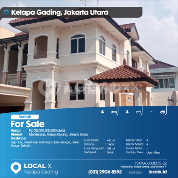 Siap Huni, Posisi Hoek, Unit Rapi, Lokasi Strategis, Dekat Dengan Sekolah For Sale - Jual Rumah Mediterania, Kelapa Gading, Jakarta Utara Harga. Rp 2500000xxxxJual) Deskripsi Properti. Siap Huni, Posisi Hoek, Unit Rapi, Lokasi Strategis, Dekat Dengan Sekolah Luas Tanah. 455 m2 Dimensi. 13x35 Luas Bangunan. 288 m2 Sertipikat. SHM Kamar Tidur. 4 Kamar Mandi. 4 Garasi Mobil. - Hadap / View. Utara - Barat LOCAL X Kelapa Gading ******** ⓪②① ②⑨⓪⑥ ⑧⑤⑨⑤ P3KPG-0000xxxx-ZZ-J