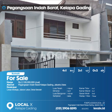 Lokasi Strategis, Jalanan Lebar, Dekat Sekolah For Sale - Jual Rumah Pegangsaan Indah Barat Kelapa Gading, Jakarta Utara Harga. Rp 210000xxxxJual) Deskripsi Properti. Lokasi Strategis, Jalanan Lebar, Dekat Sekolah Luas Tanah. 119 m2 Dimensi. 7x17 Luas Bangunan. 110 m2 Sertipikat. SHM Kamar Tidur. 4+1 Kamar Mandi. 2+1 Garasi Mobil. 0+2 Hadap / View. Timur LOCAL X Kelapa Gading ******** ⓪②① ②⑨⓪⑥ ⑧⑤⑨⑤ P3KPG-0000xxxx-ZZ-J