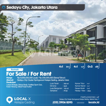 Lokasi Strategis, Bebas Banjir, Fasilitas Sport Club, Kolam Renang, Dekat Pusat Kuliner For Sale / For Rent - Jual / Sewa Rumah Sedayu City Cluster Springwood Kelapa Gading, Jakarta Utara Harga. Rp 900000xxxxJual) / Rp 20000xxxxSewa/Tahun) Deskripsi Properti. Lokasi Strategis, Bebas Banjir, Fasilitas Sport Club, Kolam Renang, Dekat Pusat Kuliner Luas Tanah. 200 m2 Dimensi. 8x25 Luas Bangunan. 150 m2 Sertipikat. PPJB Kamar Tidur. 4+1 Kamar Mandi. 4+1 Garasi Mobil. 0+2 Hadap / View. Utara LOCAL X Kelapa Gading ******** ⓪②① ②⑨⓪⑥ ⑧⑤⑨⑤ Whatsapp/Call. Mariana - ⓪⑧①⑥④⑧③⓪⑤⑤⓪ P3KPG-0000xxxx-MT-J/S