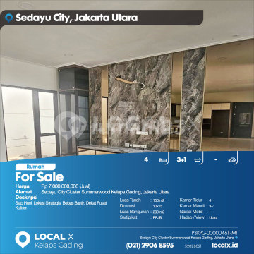 Siap Huni, Lokasi Strategis, Bebas Banjir, Dekat Pusat Kuliner For Sale - Jual Rumah Sedayu City Cluster Summerwood Kelapa Gading, Jakarta Utara Harga. Rp 700000xxxxJual) Deskripsi Properti. Siap Huni, Lokasi Strategis, Bebas Banjir, Dekat Pusat Kuliner Luas Tanah. 150 m2 Dimensi. 10x15 Luas Bangunan. 209 m2 Sertipikat. PPJB Kamar Tidur. 4 Kamar Mandi. 3+1 Garasi Mobil. - Hadap / View. Utara LOCAL X Kelapa Gading ******** ⓪②① ②⑨⓪⑥ ⑧⑤⑨⑤ Whatsapp/Call. Mariana - ⓪⑧①⑥④⑧③⓪⑤⑤⓪ P3KPG-0000xxxx-MT-J