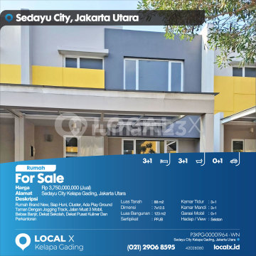 Rumah Brand New, Siap Huni, Cluster, Ada Play Ground Taman Dengan Jogging Track, Jalan Muat 3 Mobil, Bebas Banjir, Dekat Sekolah, Dekat Pusat Kuliner Dan Perkantoran For Sale - Jual Rumah Sedayu City Kelapa Gading, Jakarta Utara Harga. Rp 375000xxxxJual) Deskripsi Properti. Rumah Brand New, Siap Huni, Cluster, Ada Play Ground Taman Dengan Jogging Track, Jalan Muat 3 Mobil, Bebas Banjir, Dekat Sekolah, Dekat Pusat Kuliner Dan Perkantoran Luas Tanah. 88 m2 Dimensi. 7x12.5 Luas Bangunan. 123 m2 Sertipikat. PPJB Kamar Tidur. 3+1 Kamar Mandi. 3+1 Garasi Mobil. 0+1 Hadap / View. Selatan LOCAL X Kelapa Gading ******** ⓪②① ②⑨⓪⑥ ⑧⑤⑨⑤ P3KPG-0000xxxx-WN-J