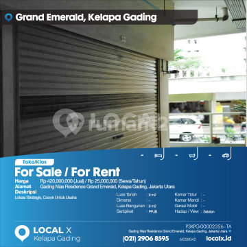 Lokasi Strategis, Cocok Untuk Usaha For Sale / For Rent - Jual / Sewa Toko/Kios Gading Nias Residence Grand Emerald, Kelapa Gading, Jakarta Utara Harga. Rp 420,000,000 (Jual) / Rp 25,000,000 (Sewa/Tahun) Deskripsi Properti. Lokasi Strategis, Cocok Untuk Usaha Luas Tanah. 9 m2 Dimensi. - Luas Bangunan. 9 m2 Sertipikat. PPJB Kamar Tidur. - Kamar Mandi. - Garasi Mobil. - Hadap / View. Selatan LOCAL X Kelapa Gading ******** ⓪②① ②⑨⓪⑥ ⑧⑤⑨⑤ P3KPG-0000xxxx-TA-J/S