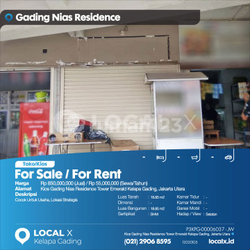 Cocok Untuk Usaha, Lokasi Strategis For Sale / For Rent - Jual / Sewa Toko/Kios Kios Gading Nias Residence Tower Emerald Kelapa Gading, Jakarta Utara Harga. Rp 850,000,000 (Jual) / Rp 55,000,000 (Sewa/Tahun) Deskripsi Properti. Cocok Untuk Usaha, Lokasi Strategis Luas Tanah. 18.85 m2 Dimensi. - Luas Bangunan. 18.85 m2 Sertipikat. SHM Kamar Tidur. - Kamar Mandi. - Garasi Mobil. - Hadap / View. Selatan LOCAL X Kelapa Gading ******** ⓪②① ②⑨⓪⑥ ⑧⑤⑨⑤ P3KPG-0000xxxx-JW-J/S