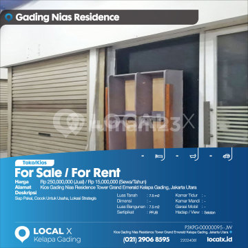 Siap Pakai, Cocok Untuk Usaha, Lokasi Strategis For Sale / For Rent - Jual / Sewa Toko/Kios Kios Gading Nias Residence Tower Grand Emerald Kelapa Gading, Jakarta Utara Harga. Rp 250,000,000 (Jual) / Rp 15,000,000 (Sewa/Tahun) Deskripsi Properti. Siap Pakai, Cocok Untuk Usaha, Lokasi Strategis Luas Tanah. 7.5 m2 Dimensi. - Luas Bangunan. 7.5 m2 Sertipikat. PPJB Kamar Tidur. - Kamar Mandi. - Garasi Mobil. - Hadap / View. Selatan LOCAL X Kelapa Gading ******** ⓪②① ②⑨⓪⑥ ⑧⑤⑨⑤ P3KPG-0000xxxx-JW-J/S