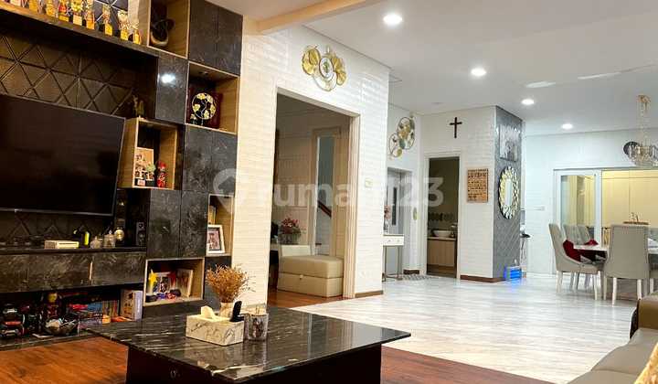 Dijual‼️ Rumah Di Beverly Hill Springhill Golf LT 153 m2 (9 x 17 m2) LB 300 m2 4 lantai KT 6 KM 3 + 1 Listrik 13200 watt Hadap Selatan Sertifikat HGB diatas HPL Air PAM lebar muka 9 m2 lebar belakang 17 m2 telepon 1 AC 12 lantai marmer ada garasi ada carport 1 ruang kerja 1 ruang belajar 1 ruang musik furniture yang menempel ditinggal Harga Rp 5.6 M