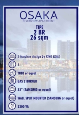 Dijual Apartemen Osaka Riverview, PIK 2, 2BR, View Taman Luas 26 m2 Kamar Tidur: 2 Kamar Mandi: 1 View: Taman Lantai: 2 AC 1 unit, ranjang Fasilitas: * Kolam renang * Gym * Lapangan basket * Minimarket * Shuttle bus ke PIK 1 Harga: 360 jt (nego) Sienly, S.E Era Peak Green Lake City 0812xxxxxxxx im