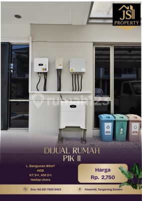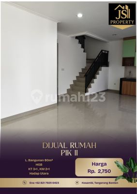 DIJUAL RUMAH 2 Lantai di PIK 2 Kosambi - Tangerang Luas Tanah 80 m² Dimensi 8x10 m² Luas Bangunan 105 m² 2 Lantai Kamar Tidur 3 + 1 ART Kamar Mandi 2 + 1 Unfurnish Listrik 6600 Watt Air WTP Sertifikat SHGB Hadap Utara Hal yang Menarik : - Kawasan Hunian Elite,nyaman dan aman - Kawasan Kuliner, CBD PIK2 Harga 2,750 M Nego ENA JS Property