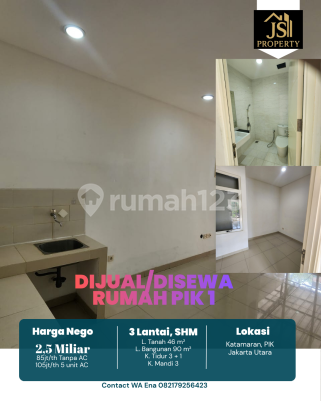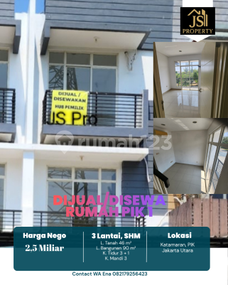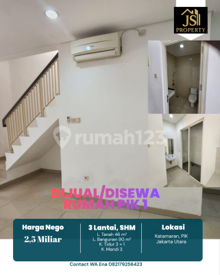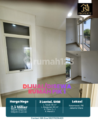 DIJUAL/DISEWA RUMAH 3 Lantai di Katamaran Indah Pantai Indah Kapuk 1 - Jakarta Utara Luas Tanah 46 m² Dimensi 4 x 11,5 m²± Luas Bangunan 90 m² 3 Lantai Kamar Tidur 3 + 1 ART Kamar Mandi 3 Full Furnish : Tidak Listrik 4400 Watt Air WTP Sertifikat SHM Hadap Utara Hal yang Menarik : - Bebas Banjir - Lokasi Premium - Food Centre - Akses Tol Pik Harga 2,5 M Nego - Sewa 85 JT/th ( Non AC ) - Sewa 105 JT/th ( Ac 5 unit )