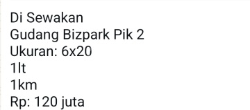 Di Sewakan Gudang Bizpark Pik 2 Ukuran: 6x20 1lt 1km Rp: 120 juta WA for more info rndmtland