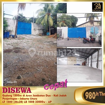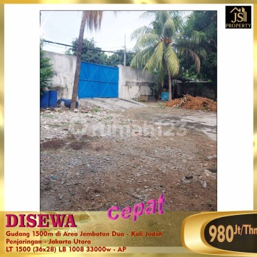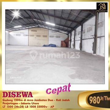 DISEWAKAN Gudang 1500m di Area Jembatan Dua - Kalijodo Penjaringan - Jakarta Utara Luas tanah1500 m Dimensi 36 m x 28 m Luas Bangunan 1008 m Bebas banjir Pln. 33.000 watt Harga 980Jt/thn Nego