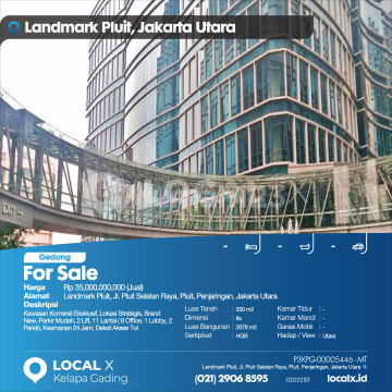 Kawasan Komersil Eksklusif, Lokasi Strategis, Brand New, Parkir Mudah, 2 Lift, 11 Lantai ( 8 Office, 1 Lobby, 2 Parkir), Keamanan 24 Jam, Dekat Akses Tol For Sale - Jual Gedung Landmark Pluit, Jl. Pluit Selatan Raya, Pluit, Penjaringan, Jakarta Utara Harga. Rp 35,000,000,000 (Jual) Deskripsi Properti. Kawasan Komersil Eksklusif, Lokasi Strategis, Brand New, Parkir Mudah, 2 Lift, 11 Lantai ( 8 Office, 1 Lobby, 2 Parkir), Keamanan 24 Jam, Dekat Akses Tol Luas Tanah. 200 m2 Dimensi. 8x Luas Bangunan. 2078 m2 Sertipikat. HGB Kamar Tidur. - Kamar Mandi. - Garasi Mobil. - Hadap / View. Utara LOCAL X Kelapa Gading ******** ⓪②① ②⑨⓪⑥ ⑧⑤⑨⑤ Whatsapp/Call. Mariana - ⓪⑧①⑥④⑧③⓪⑤⑤⓪ P3KPG-0000xxxx-MT-J