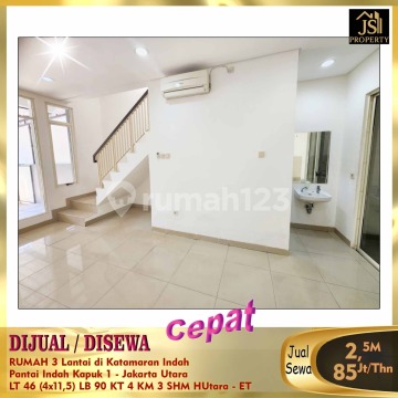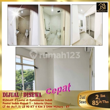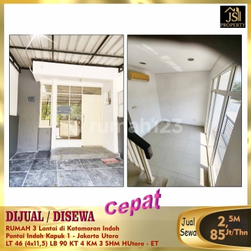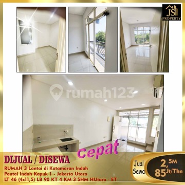 DIJUAL/DISEWA RUMAH 3 Lantai di Katamaran Indah Pantai Indah Kapuk 1 - Jakarta Utara * Bebas Banjir * Lokasi Premium * Food Centre * Akses Tol Pik * Luas Tanah 46 m² Dimensi 4 x 11,5 m² Luas Bangunan 90 m² 3 Lantai Kamar Tidur 3 + 1 ART Kamar Mandi 3 UnFurnish Listrik 4.400 Watt Air WTP Sertifikat SHM Hadap Utara Harga Jual 2,5M Nego Harga Sewa 85 Jt/Th Info dan Survey , hub : fenny - JS Property 08212553xxxx