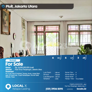 AC 5 Unit, Semi Furnished, Tenang, Aman, Lokasi Strategis, Di Pusat Kota , Pusat Perbelanjaan, Rumah Sakit, Sekolah, Pasar For Sale - Jual Rumah Pluit Timur Penjaringan, Jakarta Utara Harga. Rp 1800000xxxxJual) Deskripsi Properti. AC 5 Unit, Semi Furnished, Tenang, Aman, Lokasi Strategis, Di Pusat Kota , Pusat Perbelanjaan, Rumah Sakit, Sekolah, Pasar Luas Tanah. 530 m2 Dimensi. 26.5x20 Luas Bangunan. 540 m2 Sertipikat. SHM Kamar Tidur. 6 Kamar Mandi. 6 Garasi Mobil. 2 Hadap / View. Timur-Selatan LOCAL X Kelapa Gading ******** ⓪②① ②⑨⓪⑥ ⑧⑤⑨⑤ P3KPG-0000xxxx-AM-J