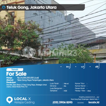 Memiliki Jalan Besar Jl Teluk Gong Raya, Strategis Untuk Usaha, Dekat Akses Pintu Tol For Sale - Jual Tanah Teluk Gong Raya Penjaringan, Jakarta Utara Harga. Rp 2400000xxxxJual) Deskripsi Properti. Memiliki Jalan Besar Jl Teluk Gong Raya, Strategis Untuk Usaha, Dekat Akses Pintu Tol Luas Tanah. 799 m2 Dimensi. 28x Luas Bangunan. 799 m2 Sertipikat. HGB Kamar Tidur. - Kamar Mandi. - Garasi Mobil. - Hadap / View. Utara LOCAL X Kelapa Gading ******** ⓪②① ②⑨⓪⑥ ⑧⑤⑨⑤ P3KPG-0000xxxx-JW-J