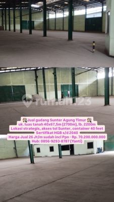 Jual gudang Sunter Agung Timur uk. luas tanah 40x67,5m (2700m), lb. 2200m Lokasi strategis, akses tol Sunter, container 40 feet Sertifikat HGB s/d 2040 Harga Jual 26 Jt/m sudah incl Ppn - Rp. 70.200.000.xxx Hub: 08569293xxxxYanti)