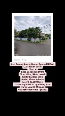 Jual Rumah Sunter Danau Agung MURAH Luas tanah 868m 2 lantai Luas Bangunan 500m 7 kmr tidur, 5 kmr mandi Sertifikat Hak Milik Hadap Timur Selatan Listrik 16.500 Watt Jalan sangat lebar, ngantong 2 sisi Harga Jual 20 M Nego Hub 0856xxxxxxxxYanti)
