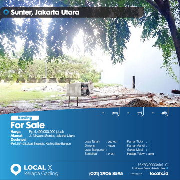 (Rp5,5jt/m2)Lokasi Strategis, Kavling Siap Bangun For Sale - Jual Tanah Kavling Nirwana Sunter, Jakarta Utara Harga. Rp 440000xxxxJual) Deskripsi Properti. (Rp5,5jt/m2)Lokasi Strategis, Kavling Siap Bangun Luas Tanah. 200 m2 Dimensi. 10x20 Luas Bangunan. 200 m2 Sertipikat. PPJB Kamar Tidur. - Kamar Mandi. - Garasi Mobil. - Hadap / View. Barat LOCAL X Kelapa Gading ******** ⓪②① ②⑨⓪⑥ ⑧⑤⑨⑤ P3KPG-0000xxxx-CI-J