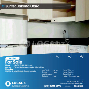 (Rp20.5jt/m2) Lokasi Strategis, Cocok Untuk Usaha For Sale - Jual Tanah Kavling Taman Sunter Agung Sunter, Jakarta Utara Harga. Rp 801550xxxxJual) Deskripsi Properti. (Rp20.5jt/m2) Lokasi Strategis, Cocok Untuk Usaha Luas Tanah. 391 m2 Dimensi. 17x23 Luas Bangunan. 391 m2 Sertipikat. HGB Kamar Tidur. - Kamar Mandi. - Garasi Mobil. - Hadap / View. Utara Timur LOCAL X Kelapa Gading ******** ⓪②① ②⑨⓪⑥ ⑧⑤⑨⑤ P3KPG-0000xxxx-TA-J