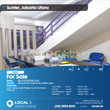 Fully Furnished, Lokasi Strategis, Cocok Untuk Kantor, Parkir Luas For Sale - Jual Ruko Danau Sunter Utara Sunter, Jakarta Utara Harga. Rp 575000xxxxJual) Deskripsi Properti. Fully Furnished, Lokasi Strategis, Cocok Untuk Kantor, Parkir Luas Luas Tanah. 84 m2 Dimensi. 4.5x18.7 Luas Bangunan. 296 m2 Sertipikat. HGB Kamar Tidur. - Kamar Mandi. 3 Garasi Mobil. - Hadap / View. Utara LOCAL X Kelapa Gading ******** 0212906xxxx P3KPG-0000xxxx-ZZ-J