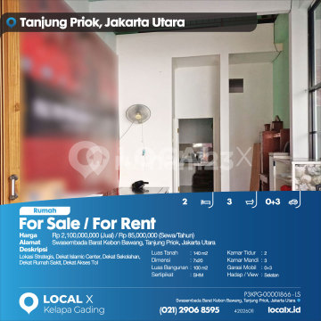 Lokasi Strategis, Dekat Islamic Center, Dekat Sekolahan, Dekat Rumah Sakit, Dekat Akses Tol For Sale / For Rent - Jual / Sewa Rumah Swasembada Barat Kebon Bawang, Tanjung Priok, Jakarta Utara Harga. Rp 210000xxxxJual) / Rp 8500xxxxSewa/Tahun) Deskripsi Properti. Lokasi Strategis, Dekat Islamic Center, Dekat Sekolahan, Dekat Rumah Sakit, Dekat Akses Tol Luas Tanah. 140 m2 Dimensi. 7x20 Luas Bangunan. 100 m2 Sertipikat. SHM Kamar Tidur. 2 Kamar Mandi. 3 Garasi Mobil. 0+3 Hadap / View. Selatan LOCAL X Kelapa Gading ******** ⓪②① ②⑨⓪⑥ ⑧⑤⑨⑤ P3KPG-0000xxxx-LS-J/S