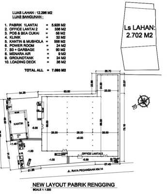DIJUAL / DISEWAKAN GUDANG BARU RENGGING, PECANGAAN, JEPARA Spesifikasi : Luas Tanah : ± 12.296 m² Luas Bangunan : ± 7.095 m² Akses : Pinggir jalan raya & kontainer Fasilitas : Office Klinik Kantin Mushola Pos Bea Cukai Ground Tank Area B3 + Garbage Menara Air Power Room Ruang Security Loading Dock Keterangan : Gudang baru siap pakai Cocok untuk industri, logistik, dan ekspor-impor HARGA JUAL : Rp 80.000.000.xxx HARGA SEWA : Rp 4.900.000.xxx / Tahun