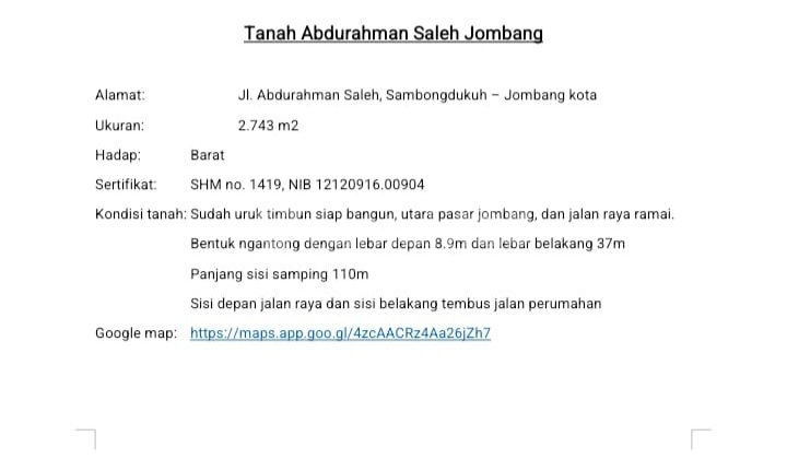 *DIJUAL TANAH ABDURAHMAN SALEH JOMBANG* jalan abdurahman saleh , sambongdukuh , jombang kota Luas Tanah 2.743 m² Hadap Barat SHM sisi depan jalan raya , sisi belakang tembus jalan perumahan bentuk ngantong dengan lebar depan 8.9m dan lebar belakang 37m , panjang sisi samping 110m lokasi di utara pasar jombang , dan jalan raya ramai kondisi tanah sudah uruk timbun siap bangun Harga 7.5 M Wa.me/628527xxxxxxx *Wimala WinMax Property* google maps : ********
