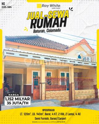 Kode Properti: NS 0126xxxx Lokasi: Jl. Fajar Indah Melati, Baturan, Kec. Colomadu, Kab. Karanganyar Temukan hunian ideal di salah satu kawasan perumahan paling favorit dan strategis di batas kota Solo, Fajar Indah! Tersedia unit rumah 2 lantai yang bisa Anda beli untuk aset masa depan atau disewa untuk tempat tinggal yang nyaman. Lokasi di Baturan, Colomadu ini dikenal memiliki akses yang sangat cepat ke Jalan Adi Sucipto, Pintu Tol, dan pusat kota Solo. Rumah ini berdiri di atas tanah seluas 120 m² dengan luas bangunan 140 m² yang memaksimalkan fungsi ruang secara vertikal (2 lantai). Dilengkapi dengan 4 Kamar Tidur, rumah ini sangat cocok untuk keluarga yang membutuhkan privasi bagi setiap anggota keluarga. Nilai tambah utama properti ini adalah statusnya yang Semi Furnish, dimana Anda sudah mendapatkan bonus fasilitas berupa 4 unit AC yang terpasang, siap menyejukkan hari-hari Anda. Terdapat juga garasi/carport yang aman untuk kendaraan. Spesifikasi Properti: Luas Tanah: 120 m² Luas Bangunan: 140 m² (2 Lantai) Kamar Tidur: 4 | Kamar Mandi: 2 Fasilitas: Semi Furnish, 4 AC, Garasi/Carport Hadap: Barat Harga Jual: Rp 115200xxxxxxxx Milyar) Harga Sewa: Rp 35.000.000,- / Tahun (35 Juta/Th) Keunggulan Lokasi (Selling Point): Kawasan Fajar Indah: Lingkungan perumahan yang tenang, bergengsi, dan memiliki nilai investasi tinggi. Fasilitas Bonus: Hemat biaya pindahan karena sudah Semi Furnish dan termasuk 4 AC. Fleksibilitas: Opsi beli untuk investasi jangka panjang atau sewa tahunan yang terjangkau (35 Juta/tahun untuk rumah 2 lantai di Fajar Indah adalah best deal). Lokasi Strategis: Dekat dengan fasilitas kuliner, sekolah, dan akses transportasi mudah. Jangan lewatkan kesempatan tinggal di kawasan elit dengan harga kompetitif ini. Hubungi kami untuk jadwal kunjungan! Hubungi kami sekarang untuk survei lokasi!