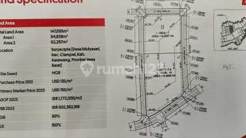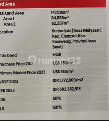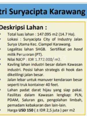 Dijual Lahan siap bangun di dalam kawasan suryacipta karawang luas 14,7 Hektar harga permeter 150 USD/ 2,5 jt/ mtr khusus untuk pabrik dan kompleks pergudangan. Tersedia berbagai Kavling Industri dan lahan komersial Jabotabek untuk Pabrik Gudang perkantoran dll. hubungi: Incess Gudang Spesialis Commercial Lands Jabotabek 0813xxxxxxxx