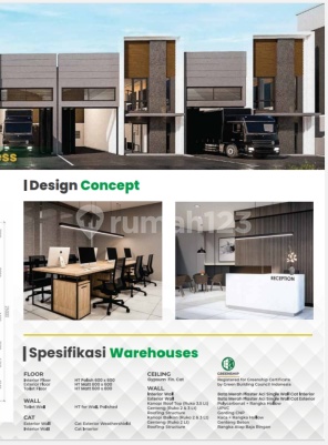 Warehouse Complex Dalam Kawasan Industri Karawang, Jawa Barat *Type Standar* Lantai : 1 Luas Tanah : 250 m2 Luas Bangunan : 230.7 m2 Dimesi : 10 x 25 Harga Tunai Keras : 3.288.000.xxx *Type Hoek* Lantai : 1 Luas Tanah : 375 m2 Luas Bangunan : 325.7 m2 Dimesi : 10 x 25 Harga Tunai Keras : 4.788.000.xxx Cara Bayar : Tunai Keras Tunai Bertahap 12-24 x KPR *Road Acces* Main Road - Row 45 Secondary Road - Row 30 Tertiery Road - Row 24 *Facilities* Waste, Water Treatment Plan Water Treatment Plant 24 Hours Security Services Premium Electricity Services 24 Hours Fire Brigade Natural Gas Telecommuniction and Internet Exclusive Helipad