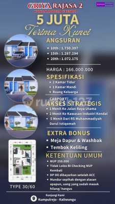 GRIYA RAJASA 2 - HUNIAN SUBSIDI MODERN DI KENDAL Bonadem, Kumpul Rejo, Kaliwungu, Kendal Regency, Central Java JAWA TENGAH, KAB KENDAL, Kaliwungu, Kumpulrejo :fire: BOOKING HANYA 5 JUTA, LANGSUNG NAIH! TIPE 30/60 | 2 KT + 1 KM + RUANG KELUARGA + CARPORT Lokasi Strategis: Kumpulrejo, Kaliwungu, Kendal HARGA TERJANGKAU: Rp 166.000.xxx Angsuran Ringan: ✅ 10 Tahun: Rp 1.730.397/bulan ✅ 15 Tahun: Rp 1.287.294/bulan ✅ 20 Tahun: Rp 1.072.175/bulan SPESIFIKASI LENGKAP & SIAP HUNI: ✅ Pondasi plat beton ✅ Atap genteng super mantili + rangka baja ringan ✅ Dinding dobel hebel ✅ Kusen kayu, plafon gypsum ✅ Lantai keramik 40x40 ✅ Listrik 1300 watt, air PDAM ✅ FREE: Meja Dapur + Washbak + Tembok Belakang Keliling! AKSES SUPER STRATEGIS: ✅ 1 menit ke jalan raya utama ✅ 2 menit ke Kawasan Industri Kendal ✅ 5 menit ke RS Muhammadiyah Darul Istigomah CARA MUDAH, PROSES JELAS: 1. Booking NUP: Rp 250.000 (cek BI Checking) 2. Jika lolos: lanjut UTJ Rp 750.000 3. DP Fleksibel: sisa Rp 4 juta bisa diangsur hingga sebelum akad 4. Biaya All-in Rp 5 juta (sudah termasuk notaris, AJB, biaya bank) ️ SUASANA KAVASAN NYAMAN & TERATUR: Lingkungan tertata, akses masuk lebar, dekat gerbang utama kawasan KIK Kendal. Terbatas hanya 74 unit! BOOKING SEKARANG! Jangan sampai kehabisan unit! Lokasi strategis, harga subsidi, spesifikasi premium. Segera hubungi marketing untuk konsultasi dan penjelasan lebih detail! Marketing Office : Prabowo Siswanto ▸ Whatsapp : ******** ▸ Whatsapp : ******** ▸ Whatsapp : ******** ▸ Bio: ******** #siswantoproperty #rumahkomersial #rumahsubsidi #rumahsemarang #rumahungaran #rumahmurah #rumahkendal #rumahcluster #rumahdijualmurah #rumahsemarangexpo #rumahjawatengah #rumahsemaranghitz #rumahjualcepat #rumahkpr
