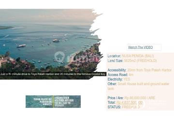 This freehold ocean-view land in Nusa Penida offers an exceptional opportunity to own a premium piece of real estate in one of Bali's fastest-growing destinations. The 56-are (5,600 m²) plot is located in a prime area with easy road access and breathtaking sea views, making it an ideal site for a private villa, boutique resort, or investment development. With its elevated position overlooking the ocean, the property captures the essence of island living while offering strong long-term value. The land features good road access and open views, providing both convenience and a stunning natural backdrop. Now available at a reduced price of IDR 86 million per are, this property presents a rare chance to secure a beautiful and strategically located parcel in Nusa Penida with excellent growth potential. Total Price: IDR 4,816,000,000.