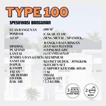 -Luas Tanah: 8 x 20 = 160 -Luas Bangunan: Type 100 - 3 Kamar Tidur - 2 Kamar Mandi - 1 Carport Mobil - Listrik 2200W BONUS Kitchen set Pagar U Cor carport Partisi ruangan Backdrop tv