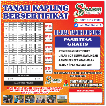 DIJUAL TANAH KAVLING STRATEGIS - INVESTASI MUDAH & FLEKSIBEL BONUS UTAMA: GRATIS PEMECAHAN SERTIFIKAT! Lokasi: Kombeng, Kutai Timur (Kaltim) Dekat Pasar Simpang Payung Detail Kavling & Skema Harga: Blok A 1 - A 9: Rp 100 JT (DP 20%) Blok A 10 - A 27: Rp 95 JT (DP 15%) Blok B 1 - B 18: Rp 90 JT (DP 10%) Blok C 1 - C 18: Rp 85 JT (DP 5%) Blok D 1 - D 18: Rp 80 JT (DP 0% / Tanpa DP) Ukuran Tanah: 10x20 m & 10x18 m Legalitas: SHM (Sertifikat Hak Milik) Fasilitas & Keunggulan: Sangat Cocok untuk Hunian / Perumahan Jalan Cor & Lampu Penerangan Jalan Waduk / Penyediaan Air Sementara Kemudahan Pembayaran: Tenor Fleksibel: Angsuran sisa DP bisa dicicil 10 - 36 bulan Bisa Cash, Cash Tempo, atau Tukar Tambah Lahan DP bisa pakai Mobil atau Motor Harga: Mulai dari Rp 80.000.000 Info & Survey: 0823xxxxxxxx a.n. SBRI Kode Listing: KTT-B47